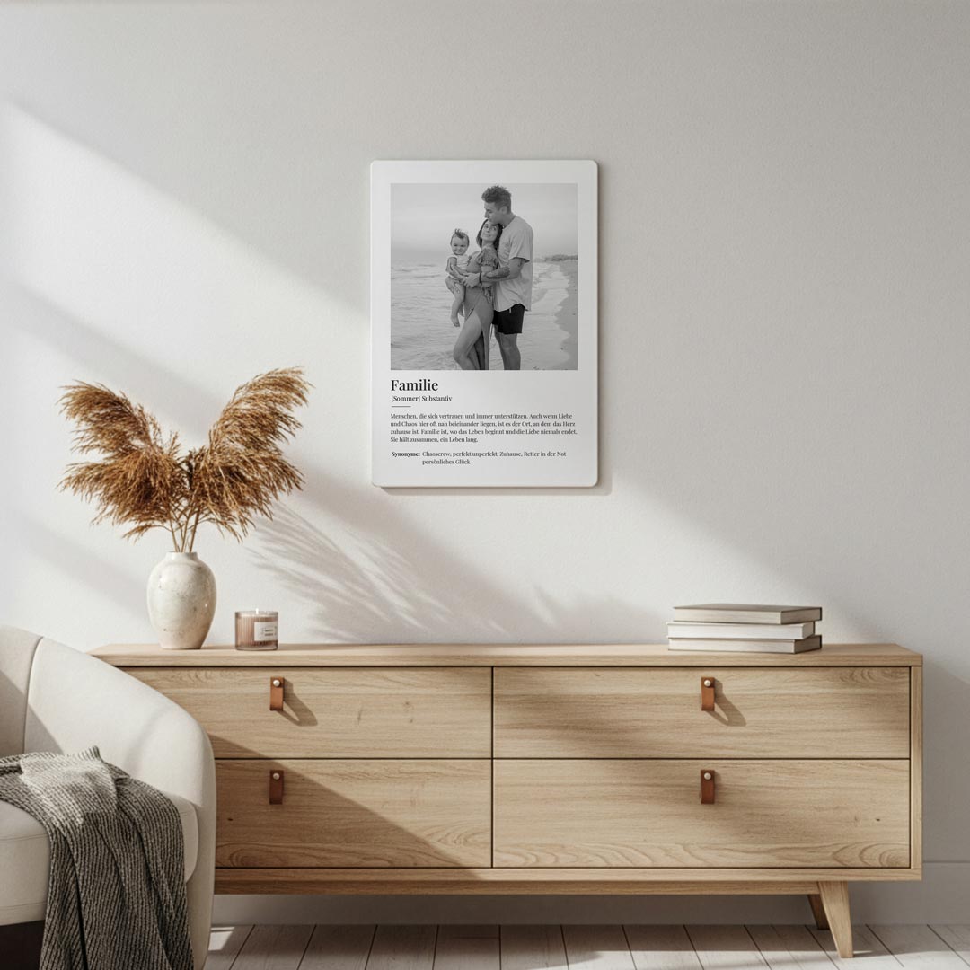 Mach dein Zuhause noch besonderer - mit dem edlen Metallposter Definition Familie. Gedruckt auf einer hochwertigen, beschichteten ChromaLuxe-Aluplatte verwandelt es jedes Motiv in ein brillantes Kunstwerk. Der aufwendige Sublimationsdruck sorgt für gestochen scharfe Farben, extreme Haltbarkeit und eine beeindruckende High-Definition-Wirkung. Durch die ultradünne 1,1-mm-Metallplatte und die rückseitigen Aluminiumschienen schwebt dein Bild elegant an der Wand.