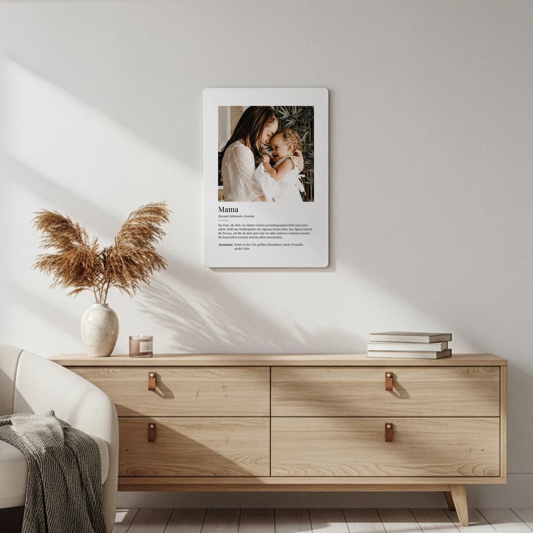 Mach dein Zuhause noch besonderer - mit dem edlen Metallposter Definition Mama. Gedruckt auf einer hochwertigen, beschichteten ChromaLuxe-Aluplatte verwandelt es jedes Motiv in ein brillantes Kunstwerk. Der aufwendige Sublimationsdruck sorgt für gestochen scharfe Farben, extreme Haltbarkeit und eine beeindruckende High-Definition-Wirkung. Durch die ultradünne 1,1-mm-Metallplatte und die rückseitigen Aluminiumschienen schwebt dein Bild elegant an der Wand.