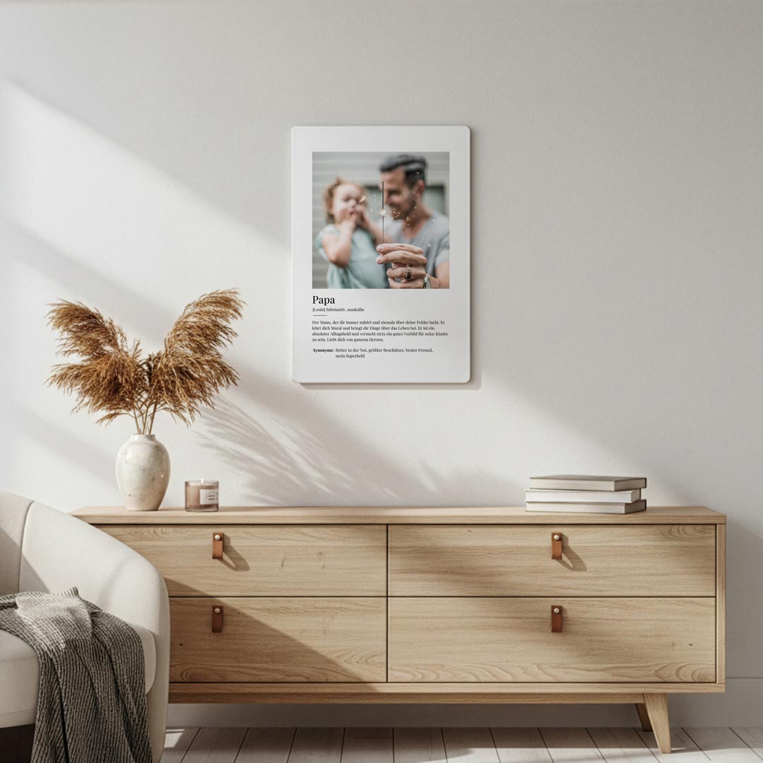 Mach dein Zuhause noch besonderer - mit dem edlen Metallposter Definition Papa. Gedruckt auf einer hochwertigen, beschichteten ChromaLuxe-Aluplatte verwandelt es jedes Motiv in ein brillantes Kunstwerk. Der aufwendige Sublimationsdruck sorgt für gestochen scharfe Farben, extreme Haltbarkeit und eine beeindruckende High-Definition-Wirkung. Durch die ultradünne 1,1-mm-Metallplatte und die rückseitigen Aluminiumschienen schwebt dein Bild elegant an der Wand.